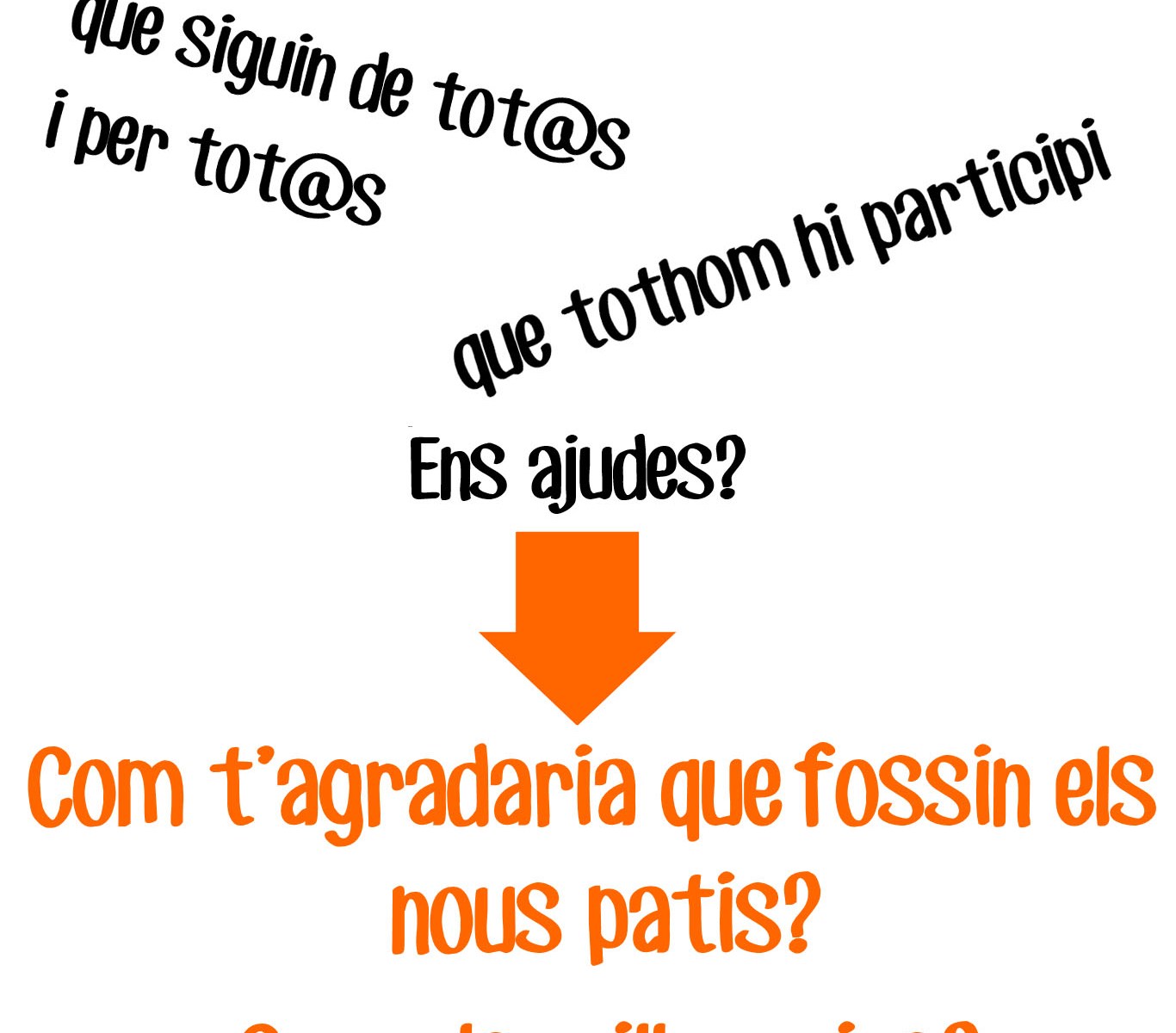 La participació al primer seminari de la PINCAT ens ha donat l’impuls necessari per convocar la 1a Sessió de Patis Vius amb els monitor/es de l’Esplai. En aquesta sessió hem debatut sobre els VALORS que volem que es reflecteixin en els nous espais exteriors. Fruit d’aquest treball en comú han sorgit aquests tres conceptes clau.